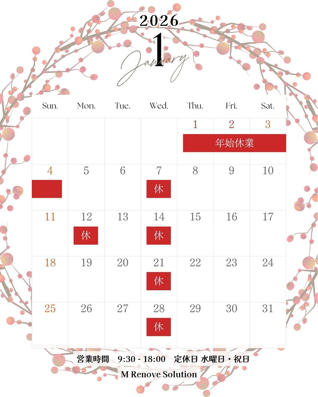 2026年1月の営業日 をお知らせいたします。
